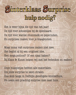 - SintSurpriseHulp: Hulp bij het maken van je SintSurprise, of thuis bij gebrek aan materialen die we in het Knutselhuis wel hebben.